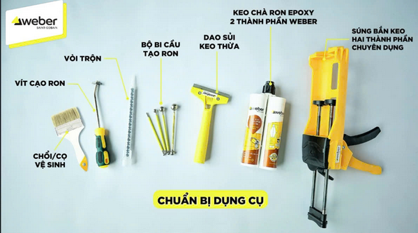 - Chuẩn bị dụng cụ: Cọ vệ sinh mạch, Vít cạo ron, Vòi trộn, Bộ bi cầu tạo mạch, Dao sủi keo thừa, Keo chít mạch 2 thành phần, Súng bắn keo chuyên dụng.