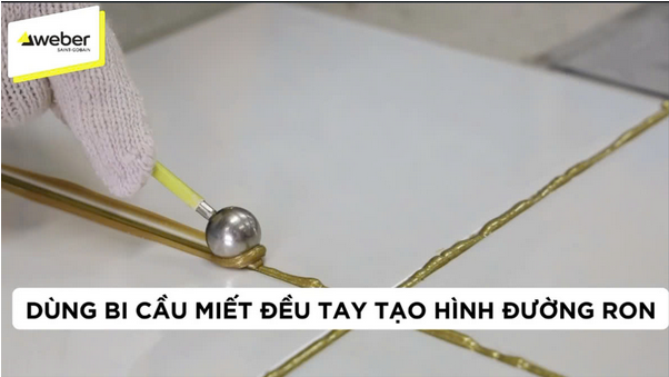 - Chà ron: Dùng ron cầu chà vào mạch đã có keo. Đây là công đoạn quan trọng nhất quyết định mạch có đẹp hay không. Chà ron bằng bi cầu phải chà đều tay (như sơn móng tay), nếu không mạch sẽ lồi lõm không đều. Ngoài ra, khi chà ron ở phần giao điểm của các mạch (ngã tư), thì phải chà từ trong giao điểm chà ra thì sẽ tạo được giao điểm đẹp, không lồi lõm.